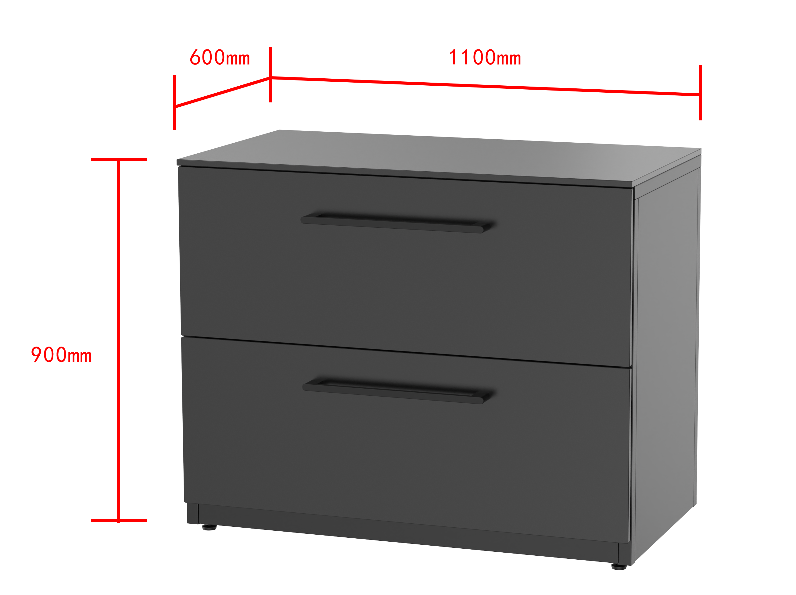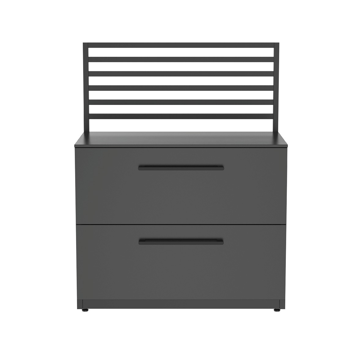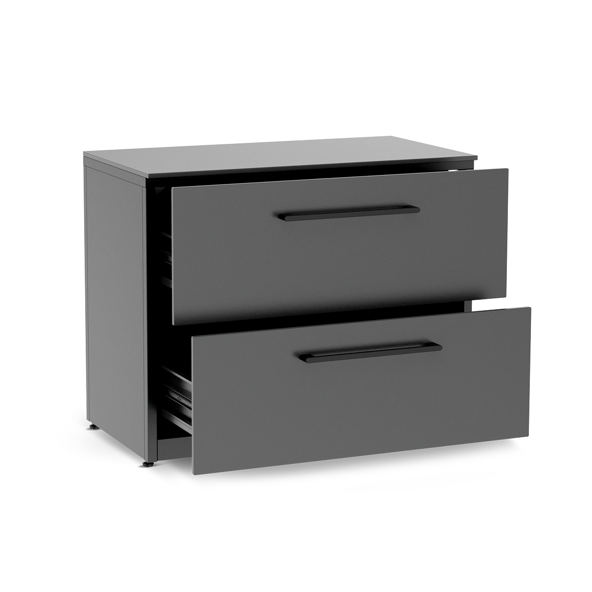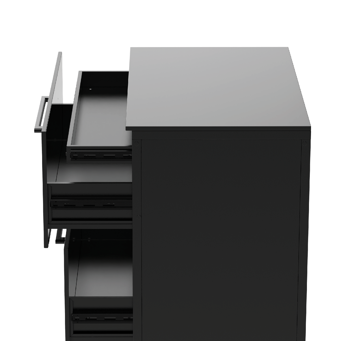 - Material: Verzinkter Stahl, mattschwarze Pulverbeschichtung, Hochdrucklaminat-Schubladen, Aluminiumgriffe