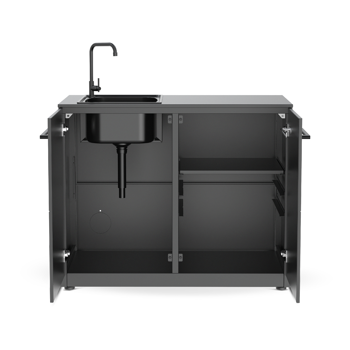 Durch die verstellbaren Beine steht die Cozze Elements Küche auf nahezu jeder Oberfläche absolut waagerecht – ideal für den Einsatz auf Terrassen, im Garten oder auf unebenen Böden. Ihr verzinkter und mattschwarz pulverbeschichteter Korpus verleiht der Küche nicht nur eine edle Optik, sondern schützt sie auch zuverlässig vor Witterungseinflüssen. Die Hochdrucklaminat-Türen und Aluminiumgriffe unterstreichen die Langlebigkeit und das zeitlose Design des Moduls.