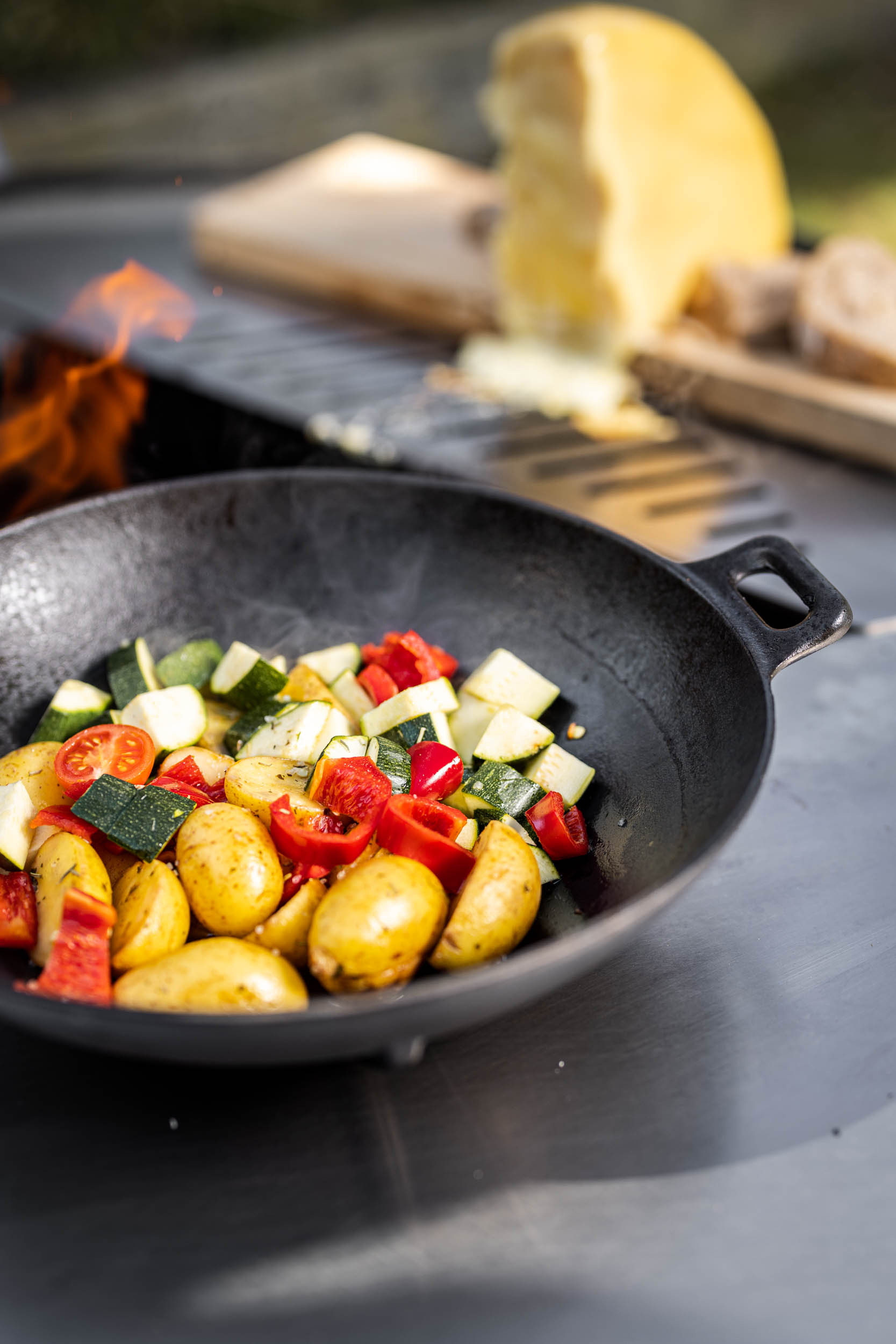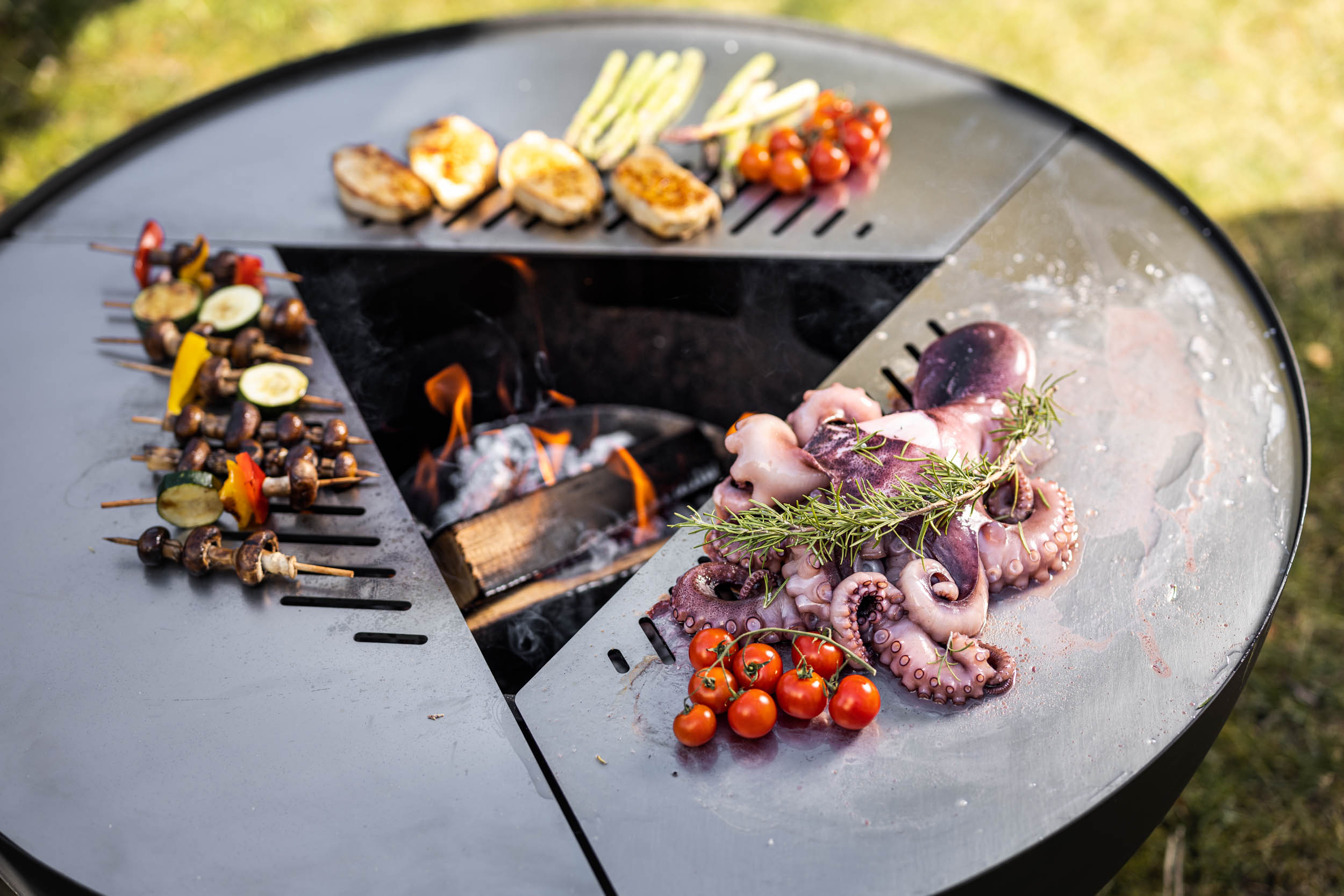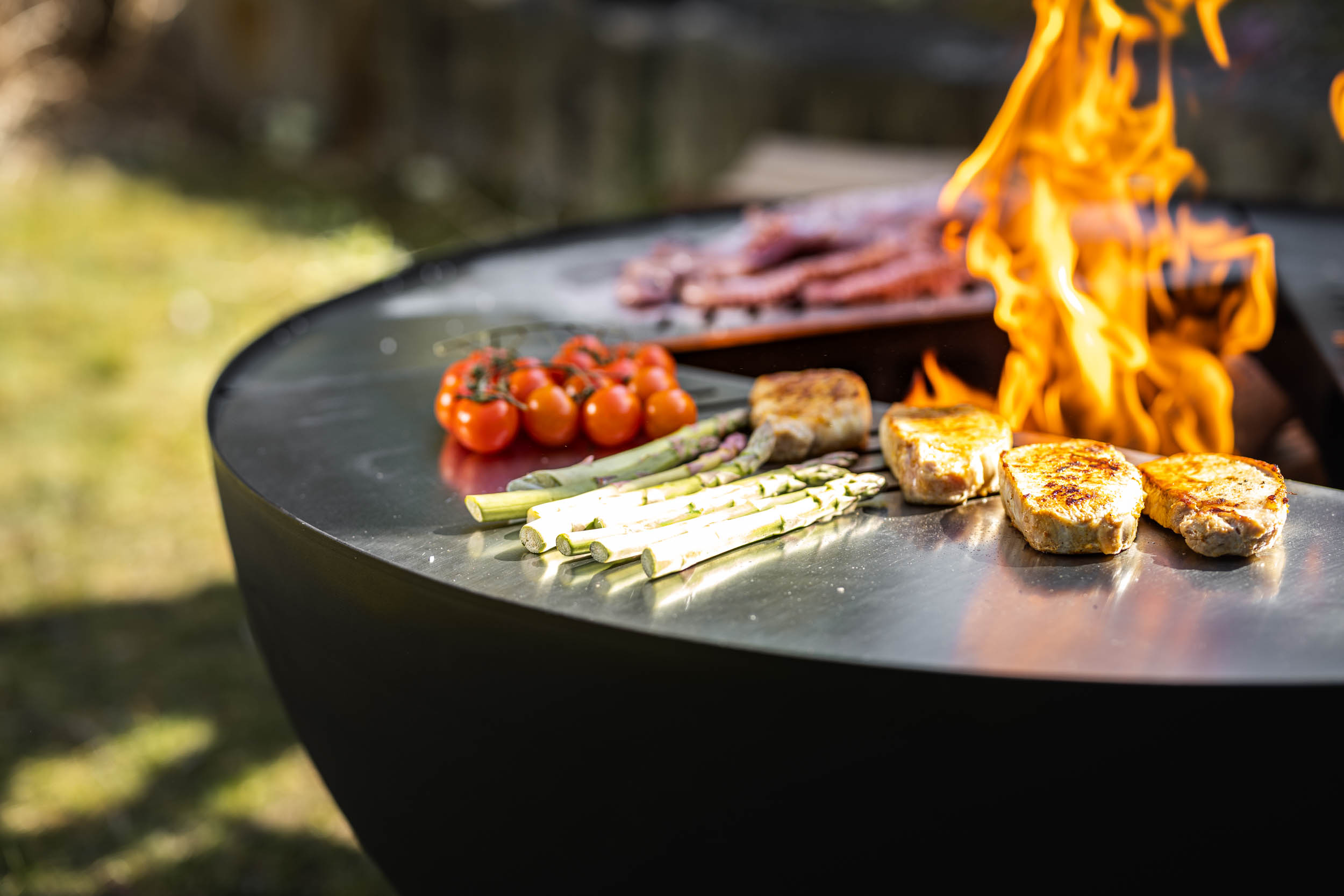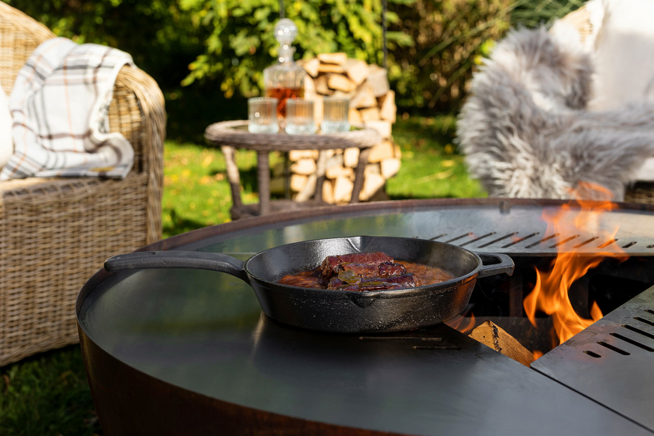 Sie lieben lange gemütliche Grillabende und das knisternde Feuer? Mit der Feuerschale Feu du Jardin TRIA lässt sich beides ganz einfach kombinieren. Im Fokus steht das offene Feuer in der Mitte der Feuerschale. Mit den drei hochwertigen Edelstahlplatten und/oder einem separat erhältlichen Grillrost können außerdem ganz einfach Gerichte mit Fleisch, Fisch und Gemüse gegrillt werden. Auf den flachen Platten lassen sich beispielsweise Spiegeleier ebenfalls leicht zubereiten.