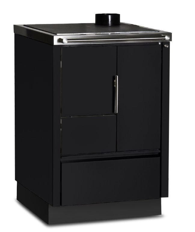 Kernstück des Herds ist der mit Schamotte verkleidete Feuerraum, in dem ein Wirkungsgrad von über 82 % erreicht werden kann. Durch modernste Verbrennungstechnik wird das Holz fast vollständig verbrannt. Der Reinigungsaufwand ist somit sehr gering. Da auch der Rest des Holzherds einen hohen Schamotte-Anteil aufweist, wird eine lange Wärmehaltung ermöglicht. Bei der Luftzufuhr entscheiden Sie selbst zwischen manueller oder automatischer Regulation. Ein optionales Sichtfenster (wahlweise links- oder rechtsseitig mit dreifacher Verglasung ist gegen Aufpreis möglich) und kann dabei Einblick in den Feuerraum gewähren. Der Anschluss kann hinten, oben oder seitlich gegenüber dem Feuerraum erfolgen. Für das Kochen steht wahlweise ein Ceran- oder Stahlfeld zur Verfügung. Überzeugen kann der Herd schließlich auch durch hitzeisolierte Edelstahlgriffe, eine frontal montierte Herdstange und das Holzschubfach im Sockelbereich.