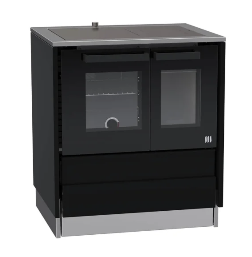 Ein Holzherd, wie man ihn noch nie zuvor gesehen hat. Hier werden traditionelle Werte zeitgemäß interpretiert. Modern, mit mattem Schwarz, Hochglanz Glasfronten und klarer, gerader Linienführung.