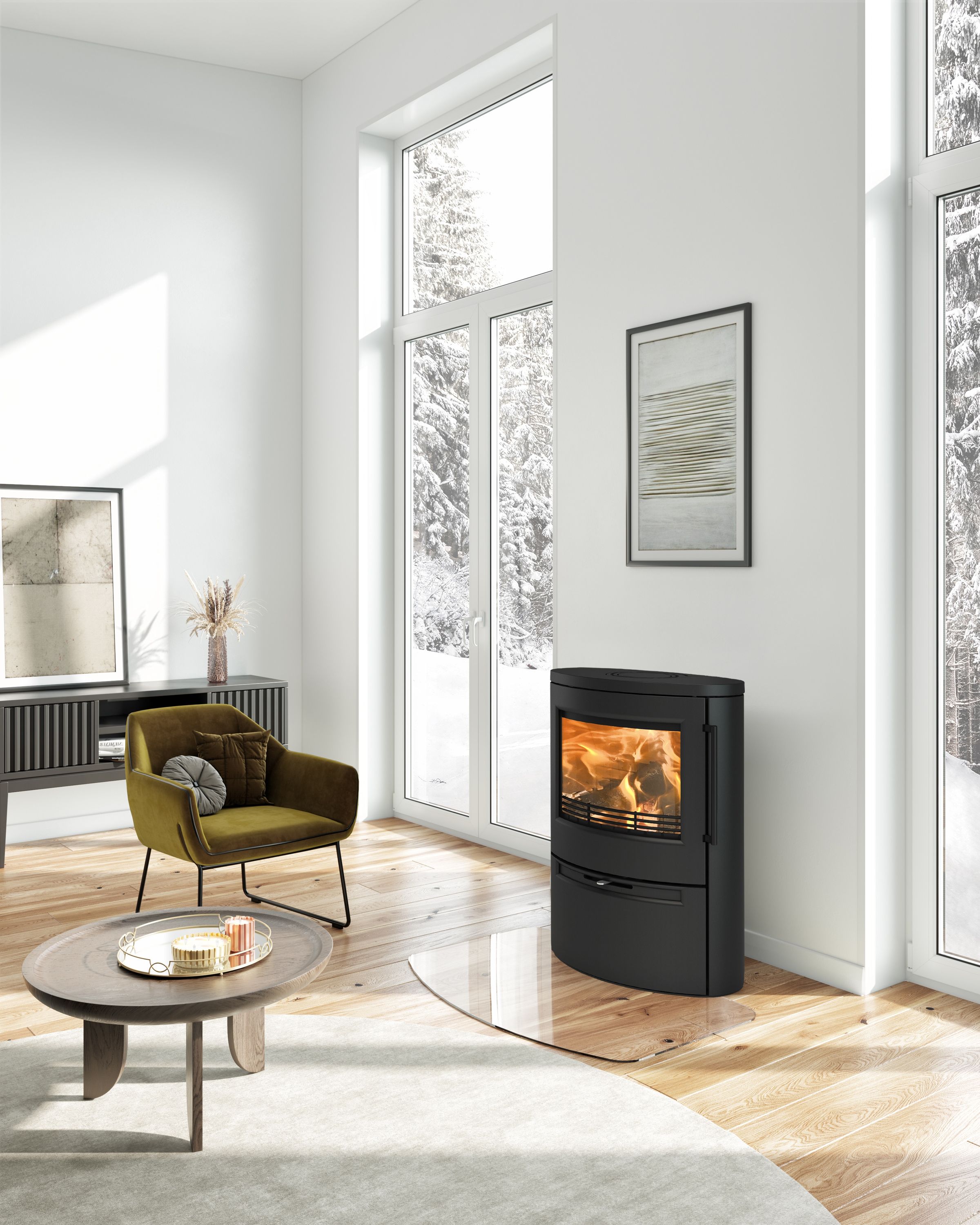 Der TT55R besticht durch seine runde Formgebung und die großzügige Sichtscheibe, die einen nahezu ungestörten Blick auf die Flammen ermöglicht. Der magnetische Schließmechanismus sorgt für eine besonders komfortable und sichere Bedienung, während die Tür zum Holzfach bereits für das optionale Kaminbesteck vorbereitet ist – so bleibt alles ordentlich und griffbereit.